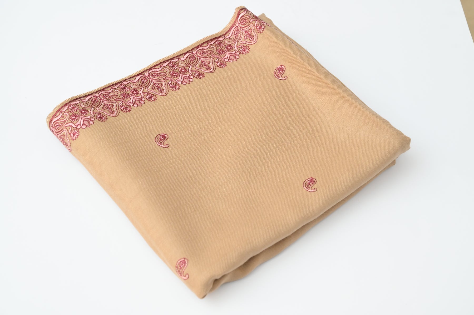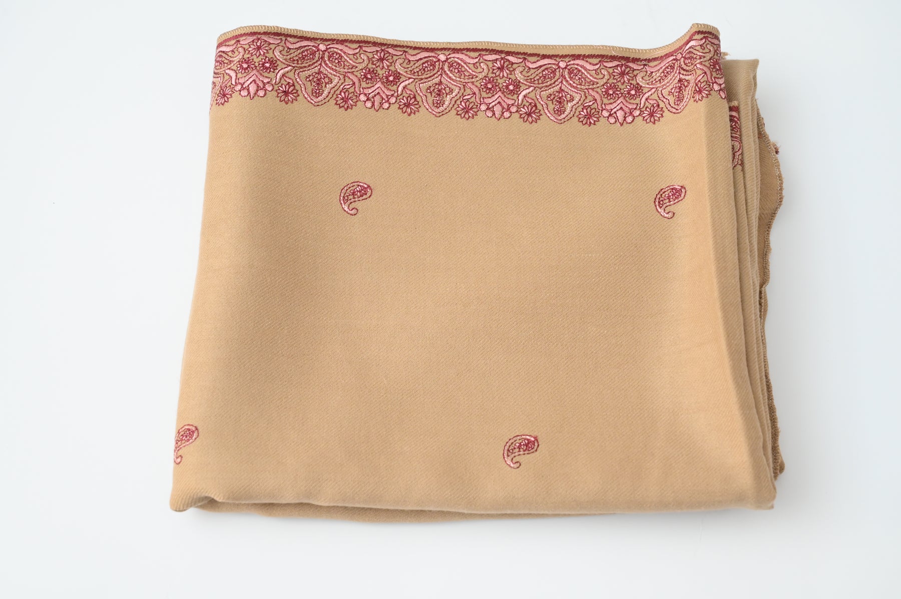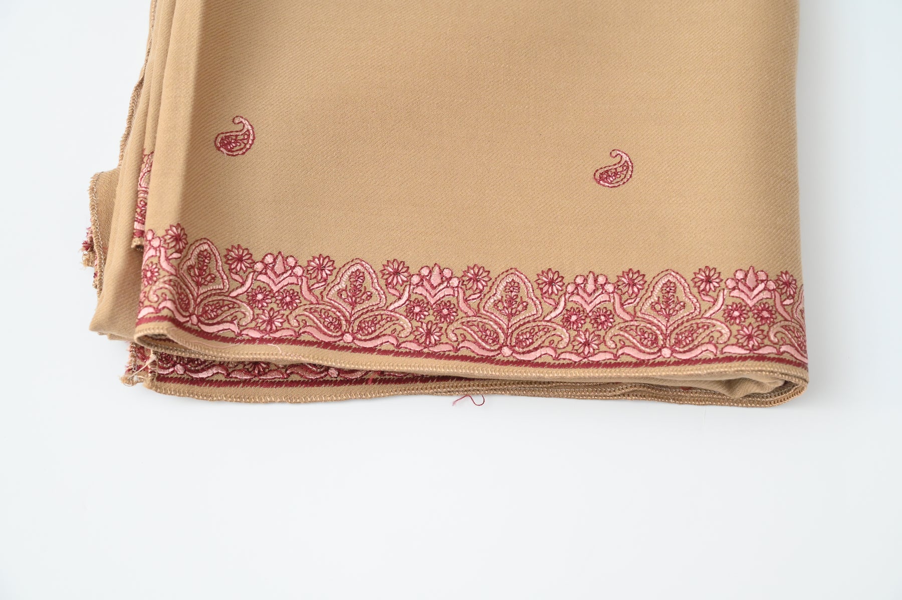 A timeless camel-toned shawl with elegant rose-maroon embroidery — soft, warm, and made to elevate every outfit.